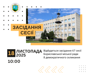 18 листопада 2025 року о 10.00 год відбудеться засідання 67 сесії Бориславської міської ради 8 демократичного скликання.