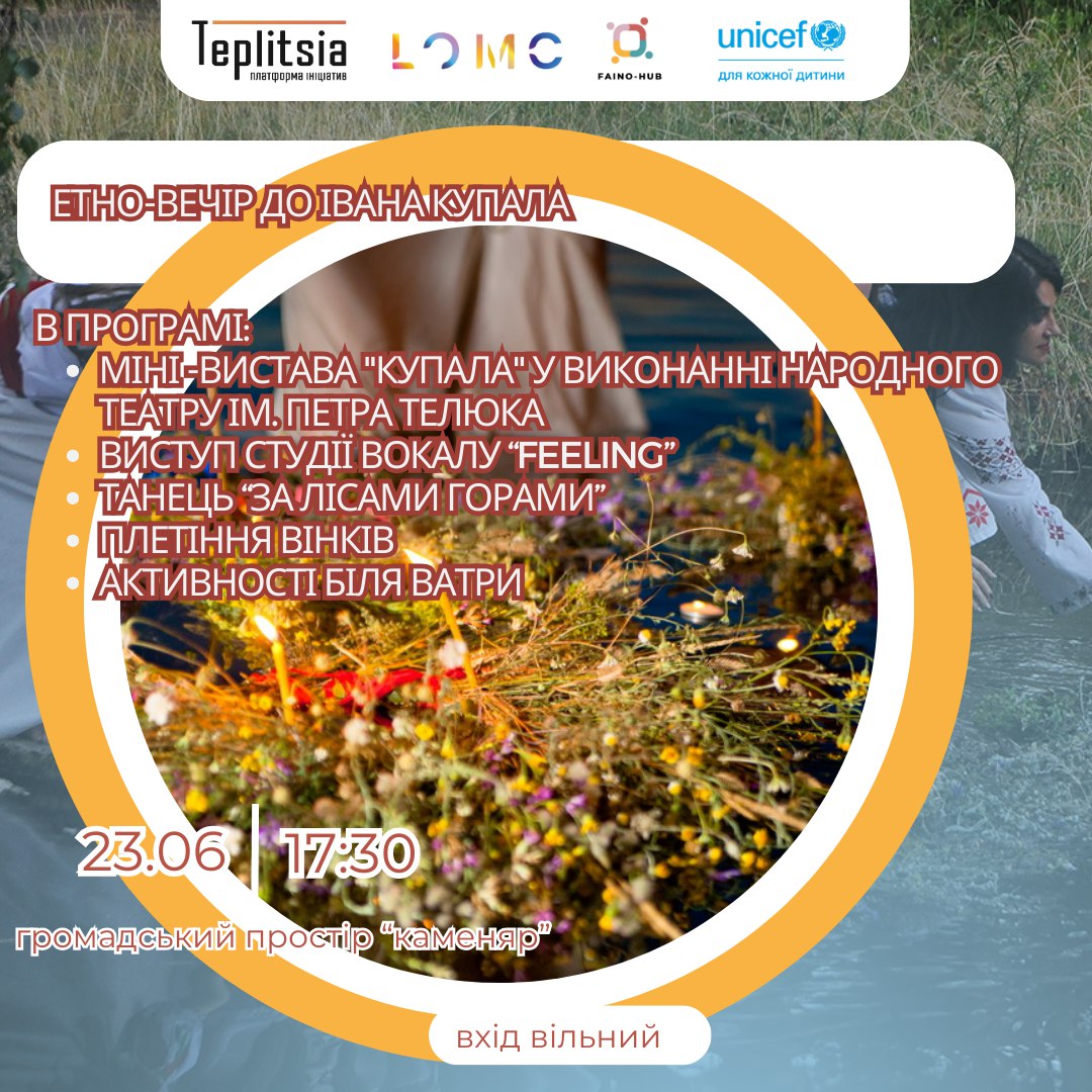 Молодіжний центр “Файно Хаб” запрошує насолодитися творчістю місцевих колективів та разом відтворити традиції. Вже цієї неділі, 23 червня, у громадському просторі “Каменяр” відбудеться етновечір до дня Івана Купала. Початок – о 17:30.
